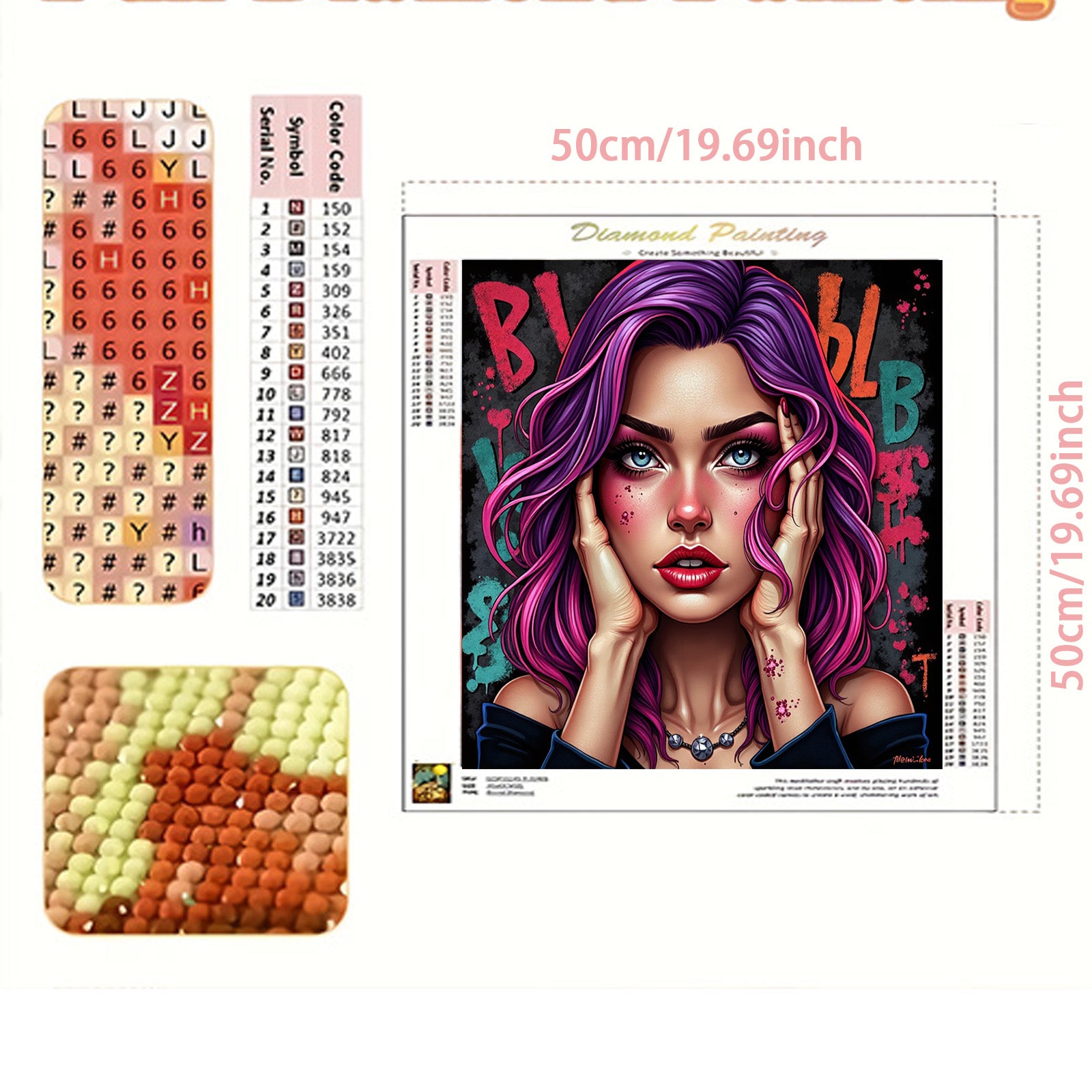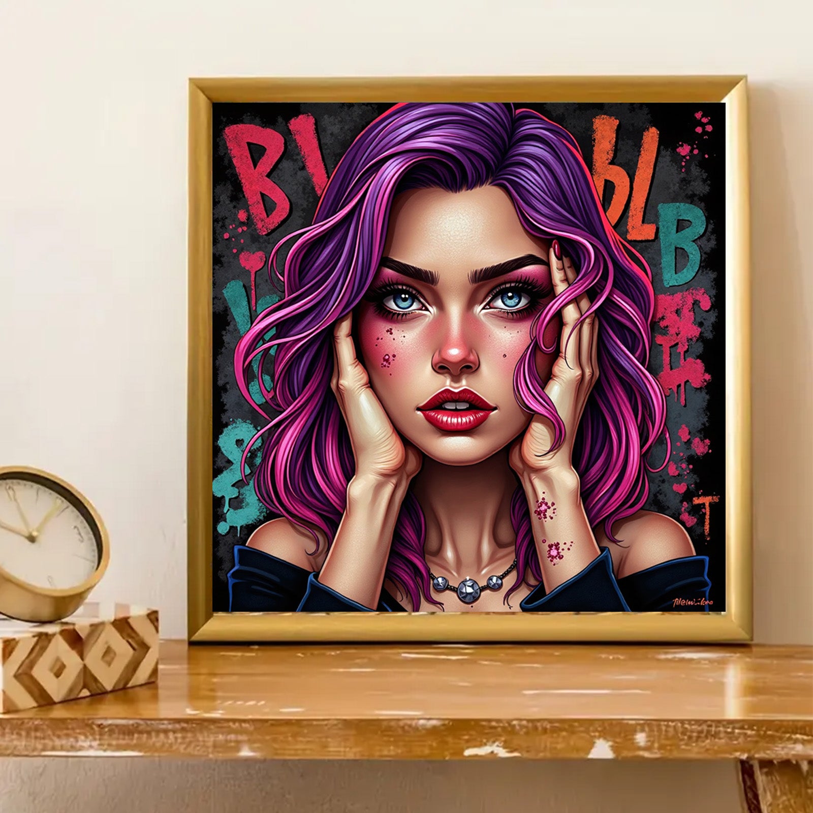 Get ready to be captivated! ✨ This dazzling diamond painting captures the essence of urban chic with a touch of vibrant artistry. "Graffiti Glam" features a stunning woman with electrifying purple and pink hair, piercing blue eyes, and bold, ruby-red lips, all framed against a backdrop of dynamic graffiti art. The striking contrast of the bright colors against the textured black background creates a captivating visual experience.